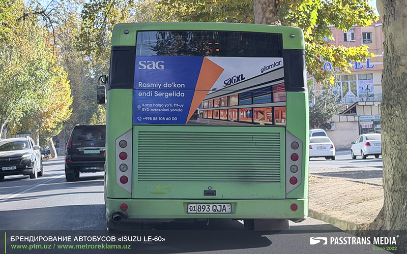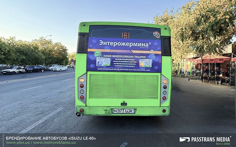 Branding of the rear board of the ISUZU LE-60 public transport buses in the city of Tashkent. The advertising dimensions of the rear board field are 81х184 cm. We make an advertising layout.