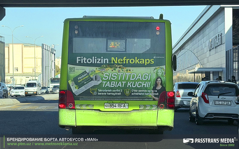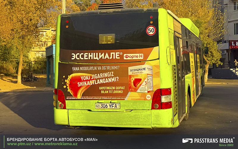 Toshkent shahrida MAN avtobuslarining orqa bortiga reklamani joylashtiramiz. Reklamaning formati 215x105 sm. Reklamaning maketini tayyorlaymiz, poligrafiya xizmatlari. Reklamaning doimiy monitoringini amalga oshiramiz.