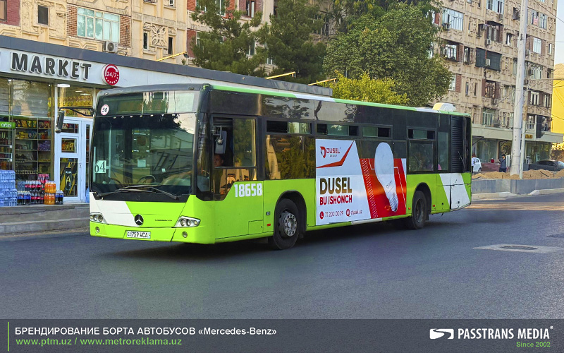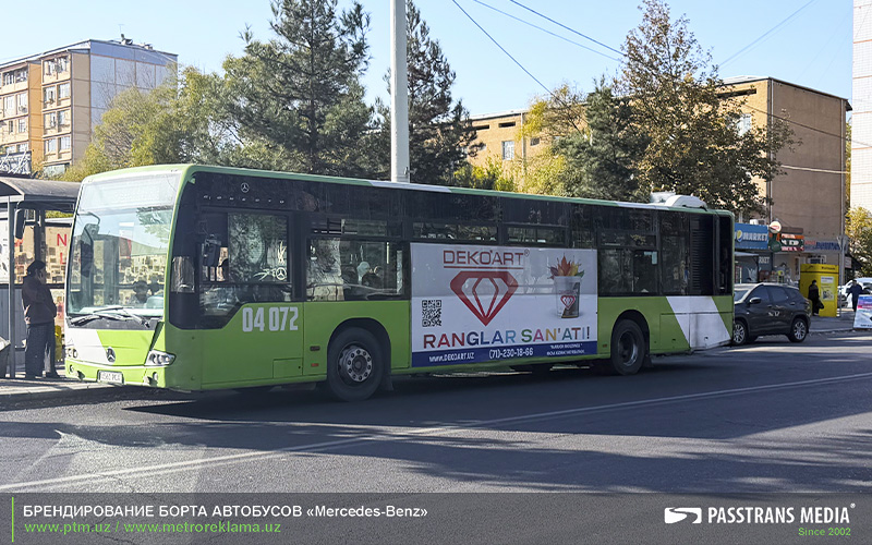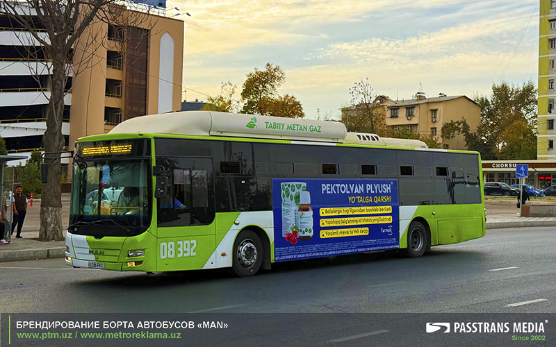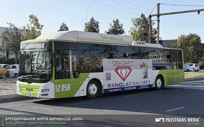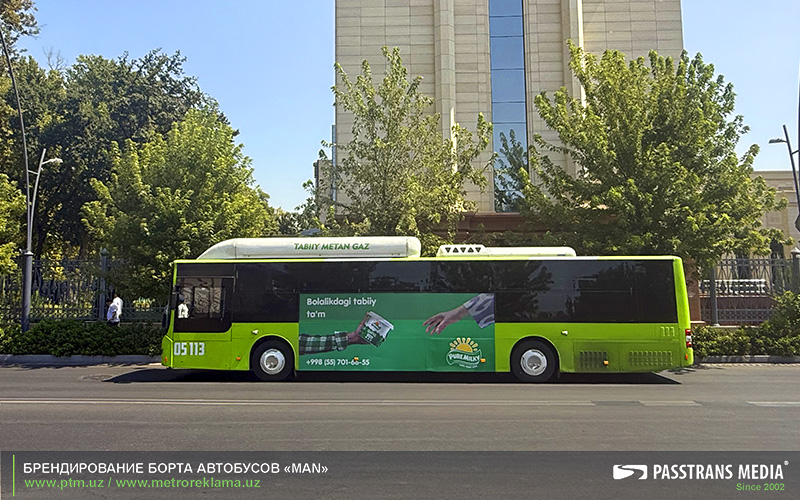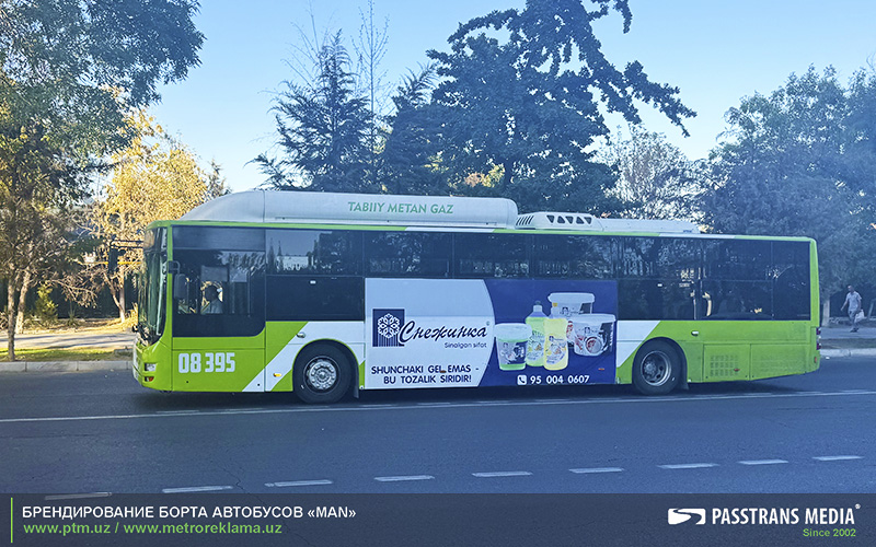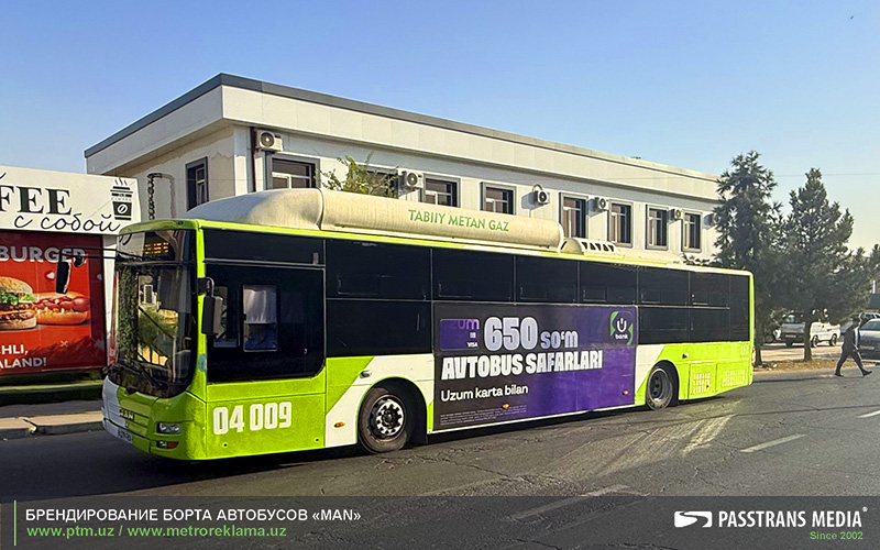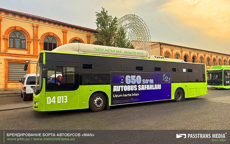 塔什干MAN巴士左车帮品牌塑造。广告规格为443х175cm。提供广告设计、印刷服务。实行广告监察。